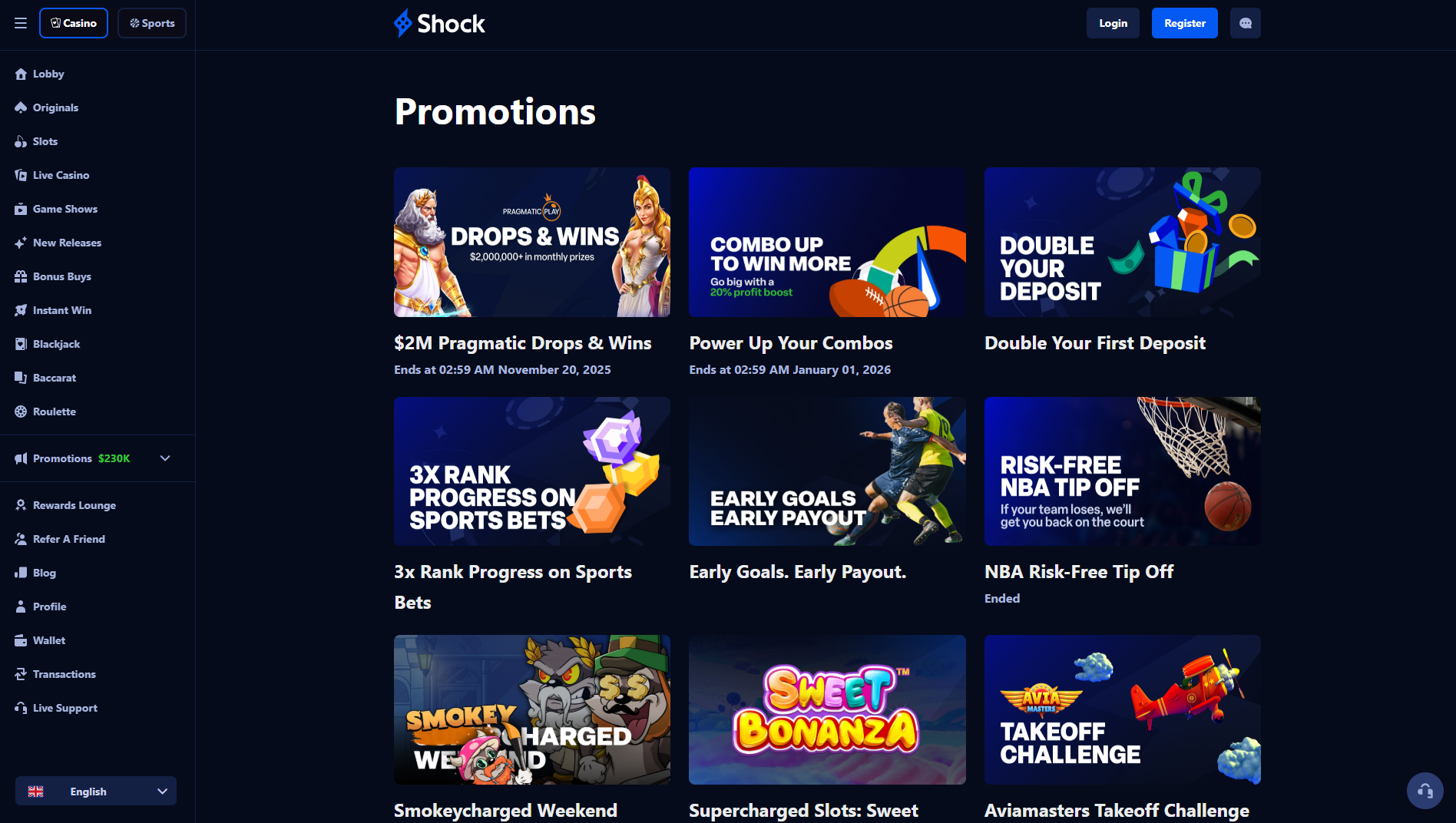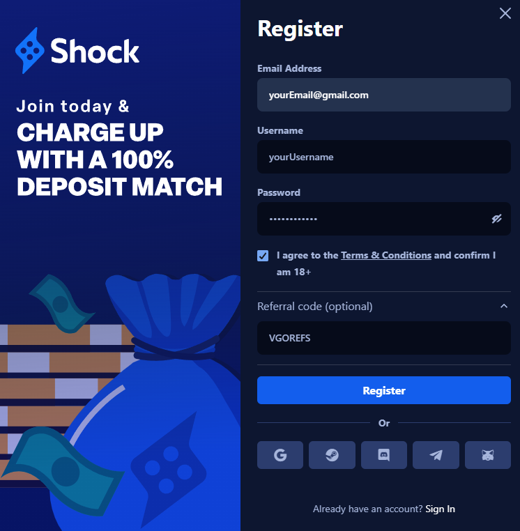 Click our affiliate link to join Shock and unlock access to all our exclusive bonuses and rewards.